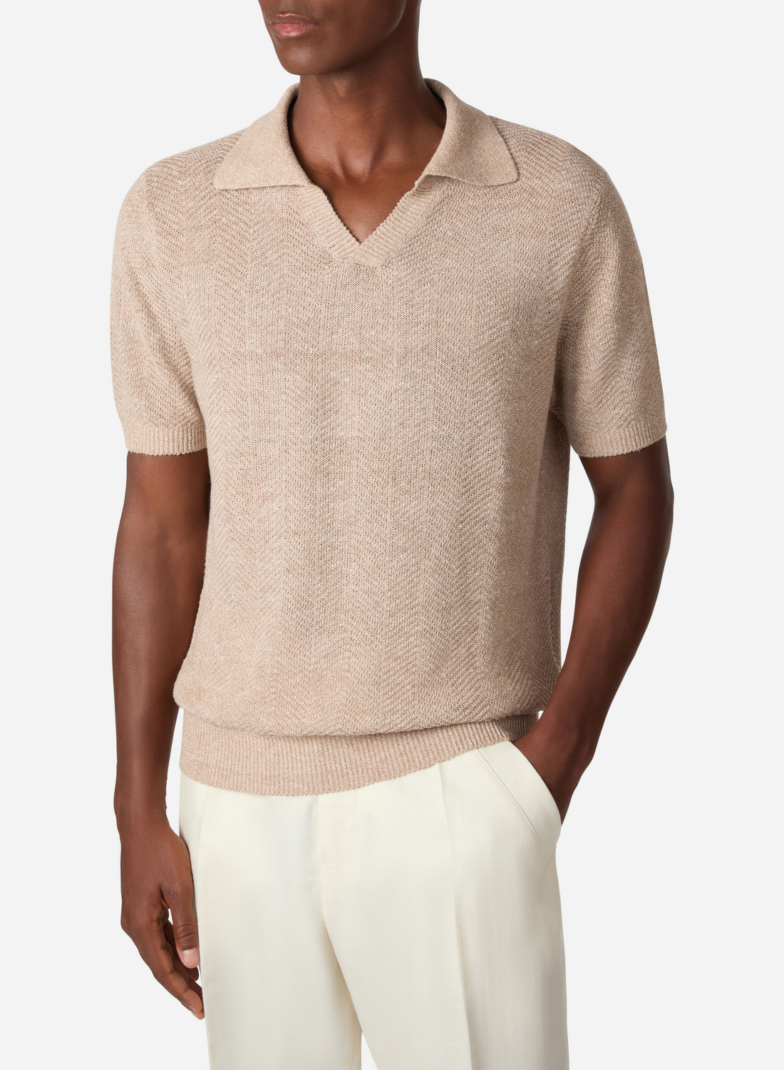 LINEN AND SILK SHORT SLEEVES HERRINGBONE V NECK POLO