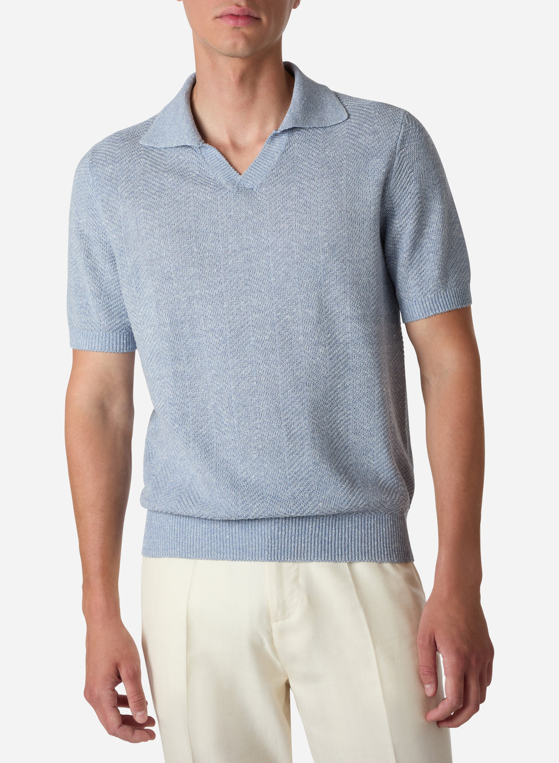 LINEN AND SILK SHORT SLEEVES HERRINGBONE V NECK POLO