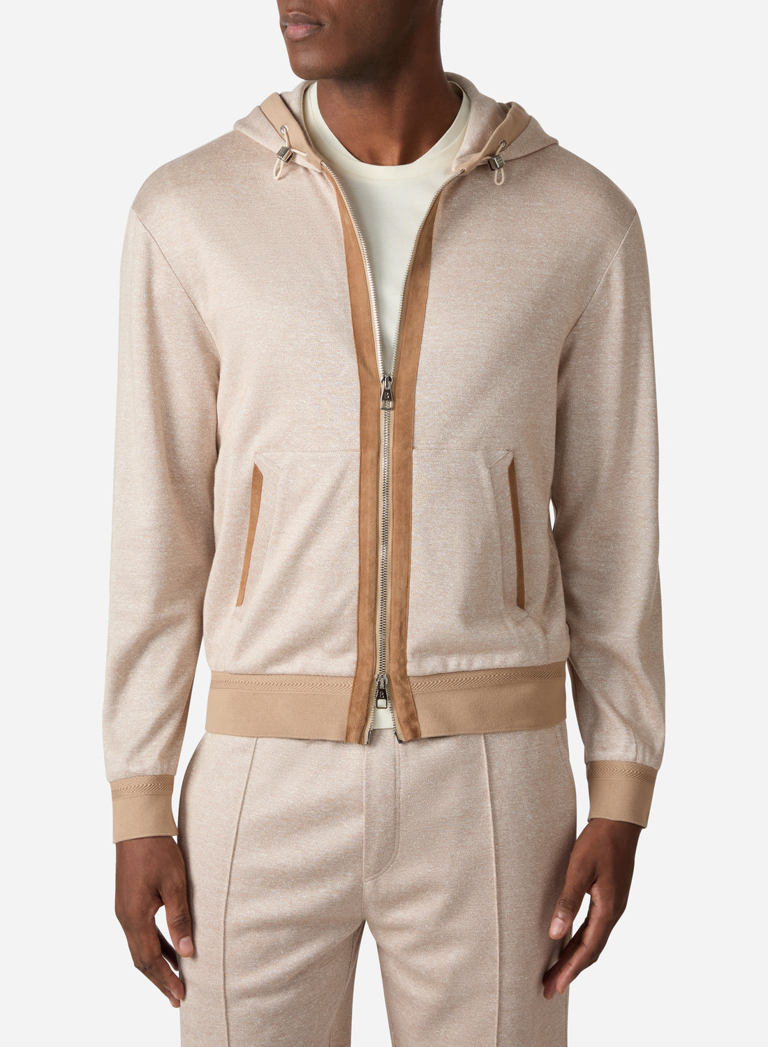 LINEN SILK COTTON HOODIE WITH SUEDE DETAILS