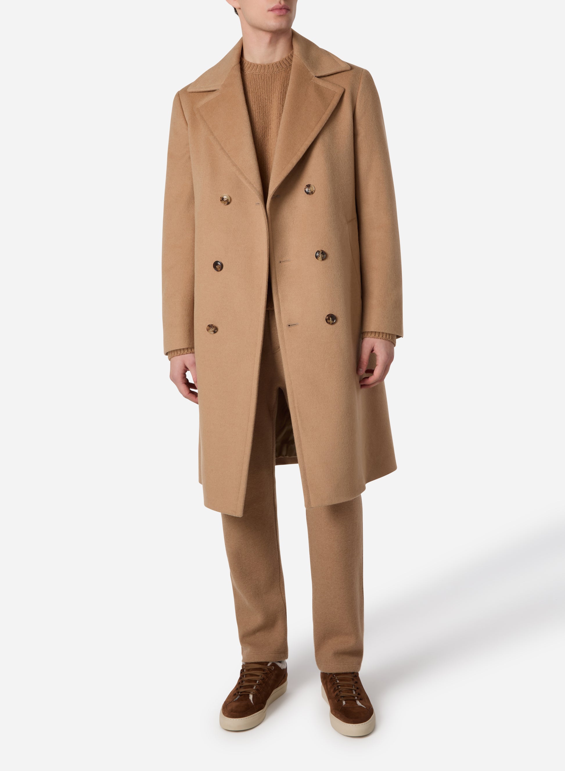 Spun from pure baby camelhair, this double-breasted coat embodies natural refinement and enduring comfort. The fabric’s innate softness creates a gentle drape, offering warmth and fluidity without heaviness. Available in camel and navy, it delivers timeless versatility - tones that transition seamlessly from daylight to evening.