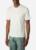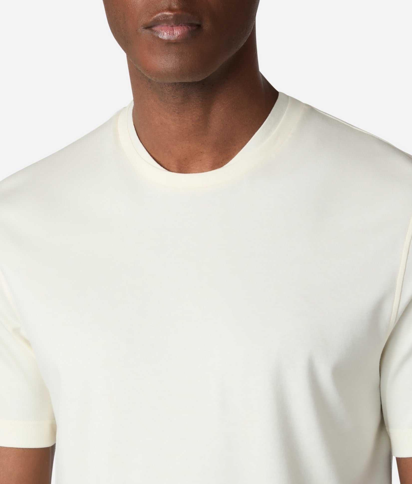 A refined T-shirt constructed from cotton and silk, the fabrication adds subtle luster and improved drape, while the high cotton content ensures breathability, structure, and durability.