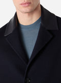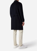 Woven from a refined blend of wool and cashmere, this double-layered overcoat combines warmth with fluid movement. The navy tone provides a timeless foundation, allowing the coat’s clean lines and structured silhouette to take center stage. Soft to the touch yet resilient in form, it is designed to carry through seasons with ease.
