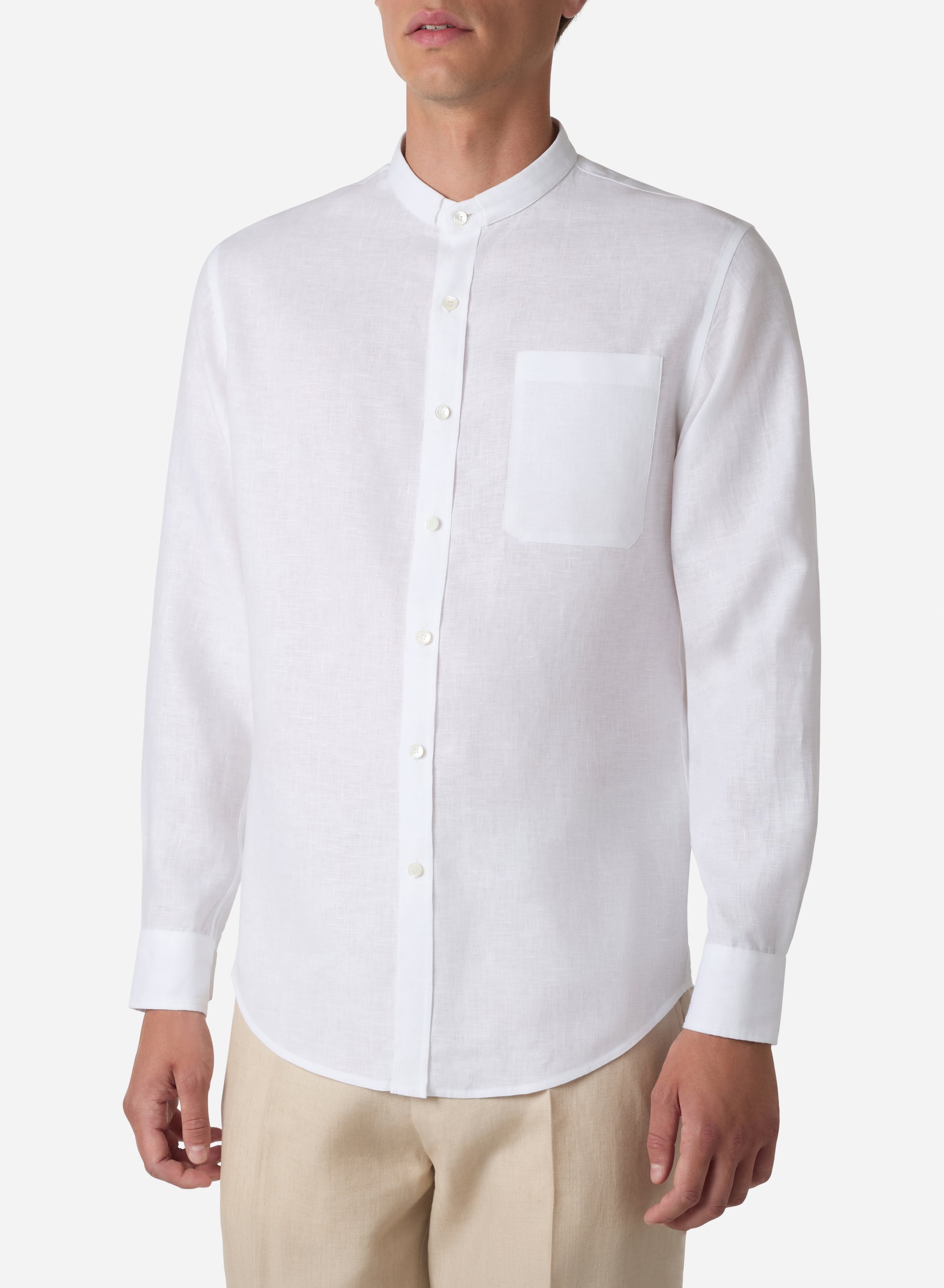 The band collar shirt refined through pure linen. Crafted from fine linen, this piece exemplifies minimalist sophistication. Ivory evokes purity and light, the sun-bleached tones of coastal architecture and pristine beaches.