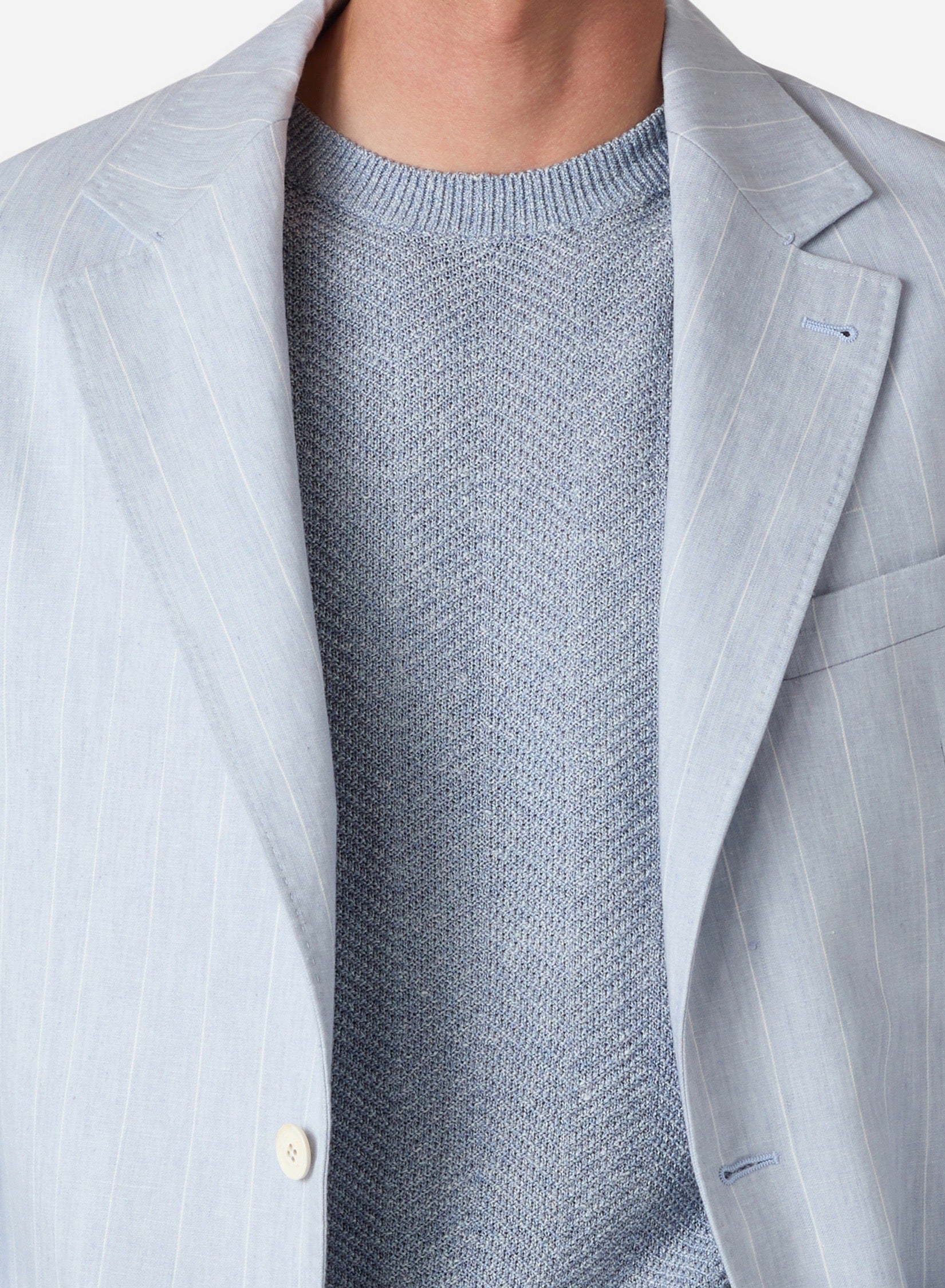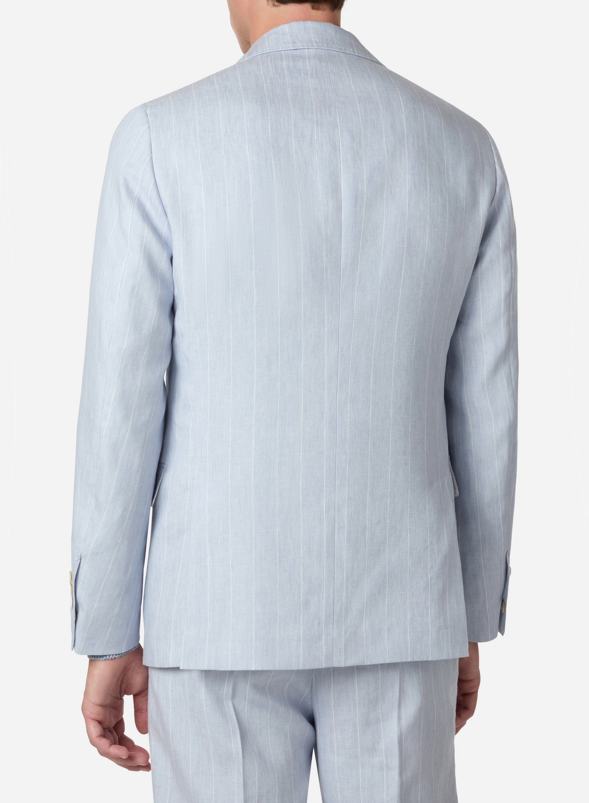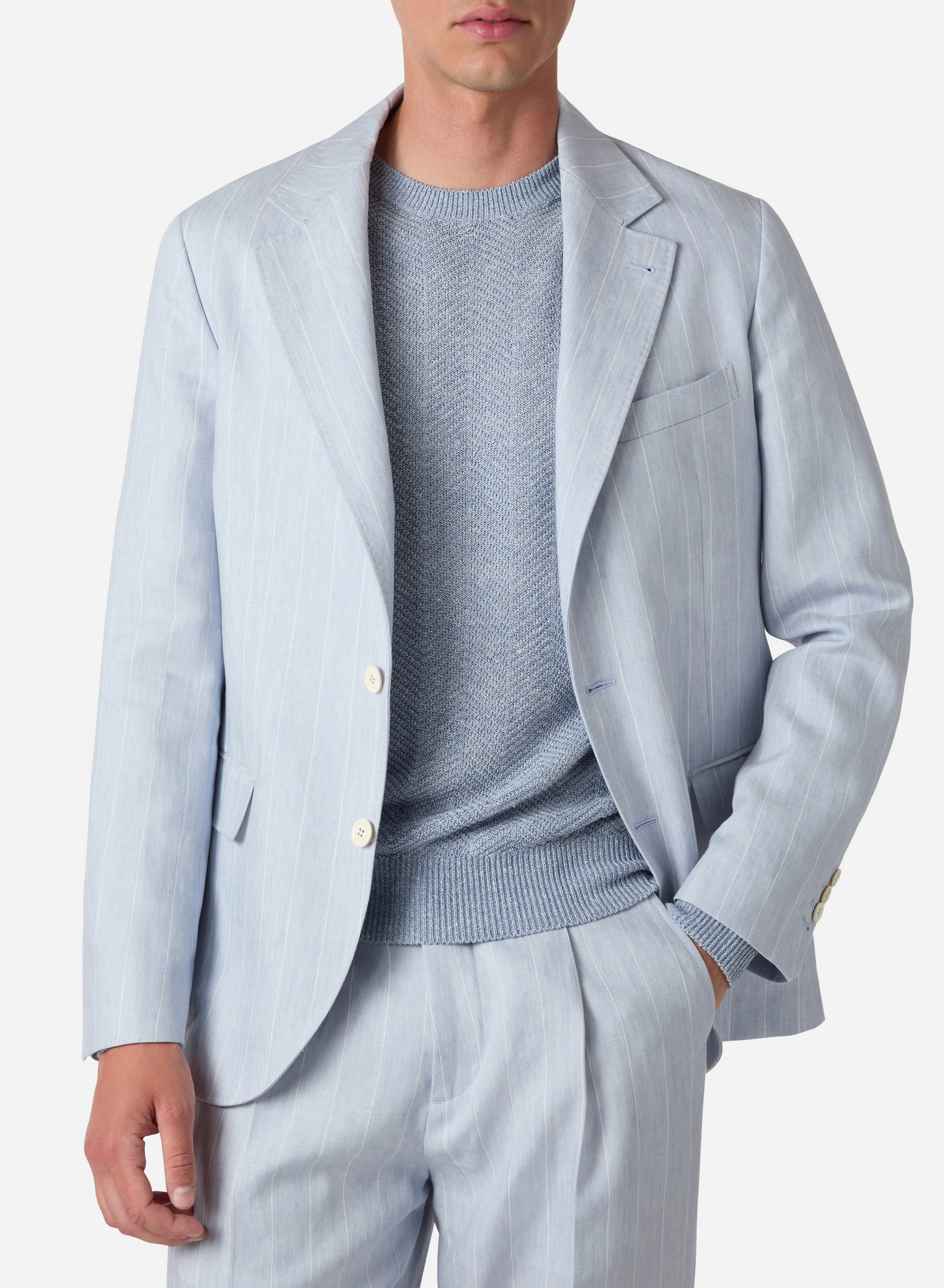 Tailoring refined through the purity of 100% linen. The single-breast blazer features a subtle pinstripe that adds visual interest while maintaining sophisticated restraint.
