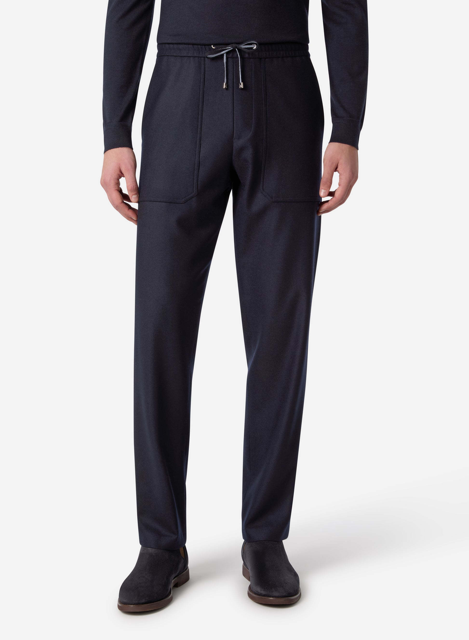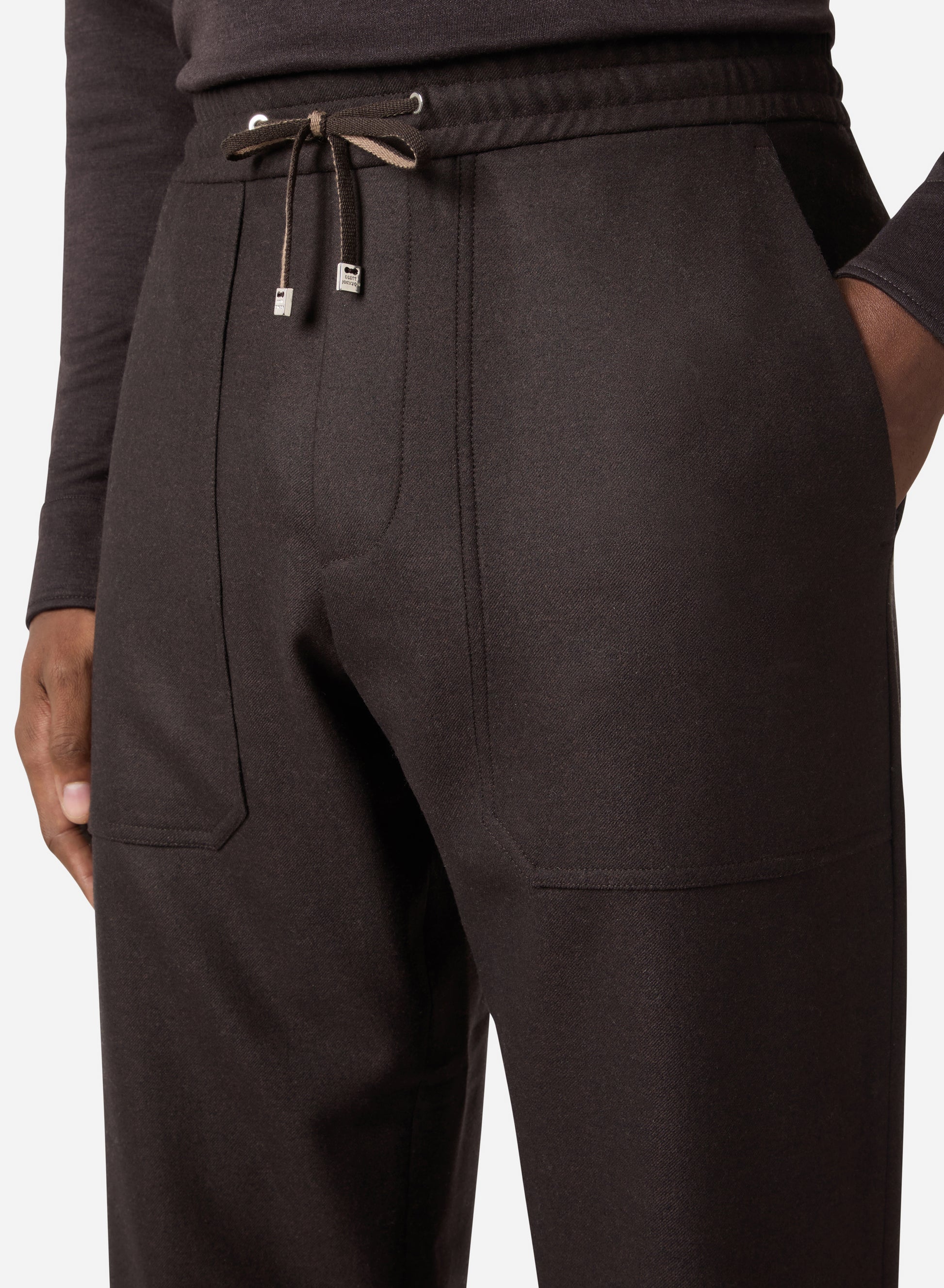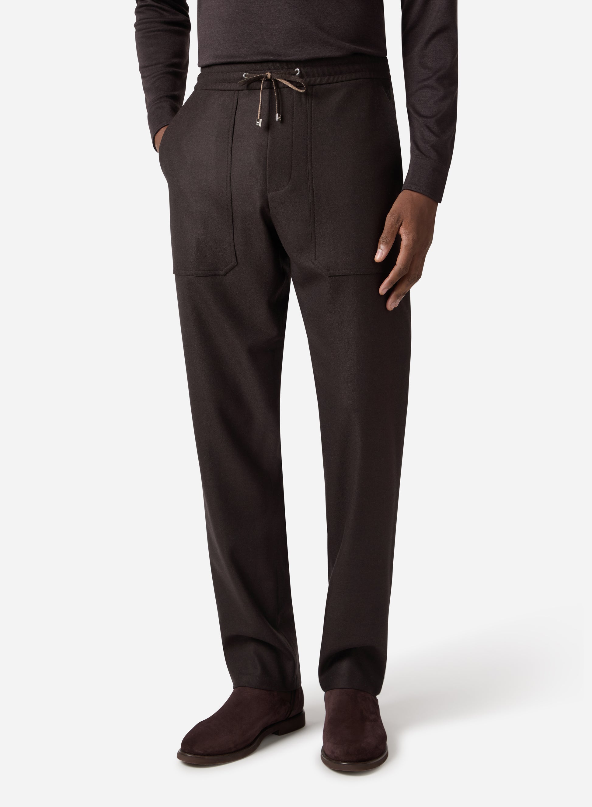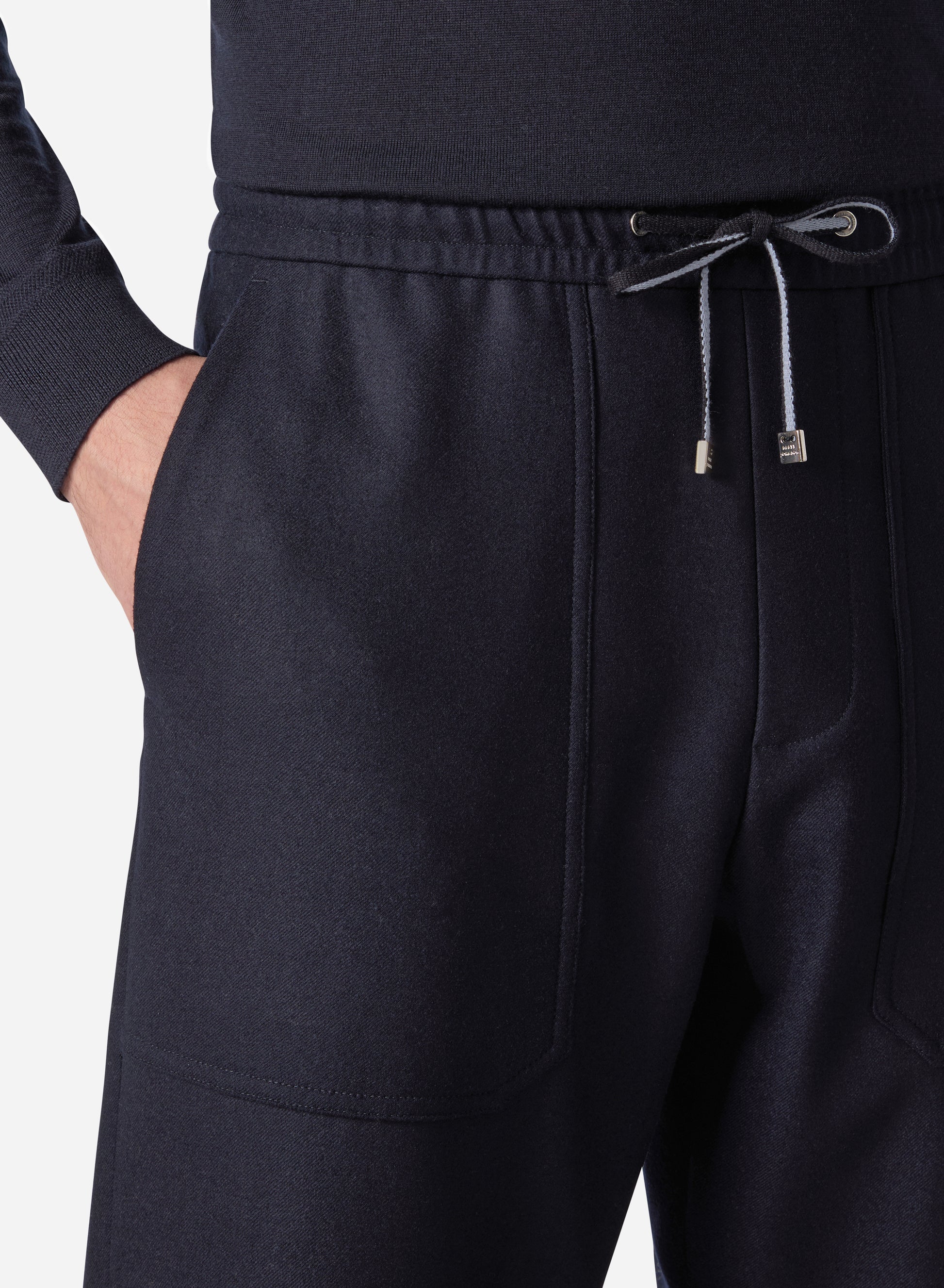 A relaxed drawstring silhouette combines casual ease with sophistication, offering comfort without compromising elegance. The superfine merino wool delivers natural breathability, a soft hand-feel, and subtle stretch, ensuring ease of movement while maintaining structure.