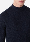 Crafted from cashmere using a twisted yarn construction, the mock-collar sweater blends multiple shades to create subtle depth and texture. Available in navy and scone, each colorway highlights the fabric’s nuanced marled effect, adding dimension to a clean, contemporary silhouette.