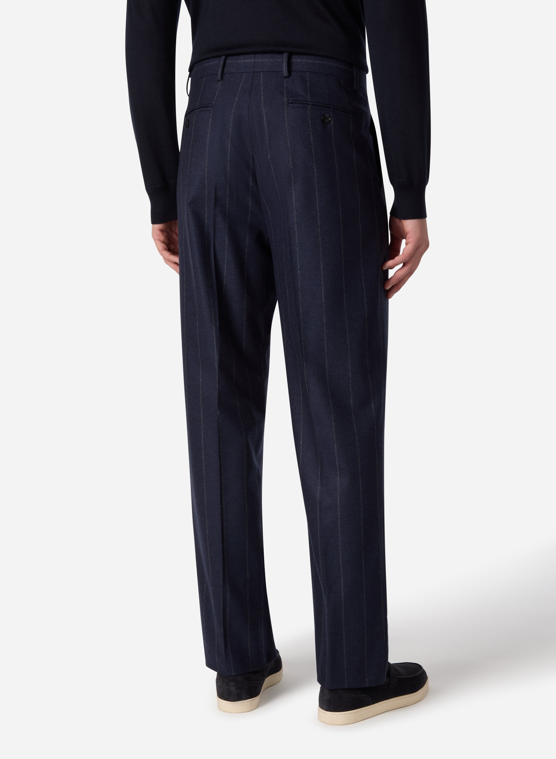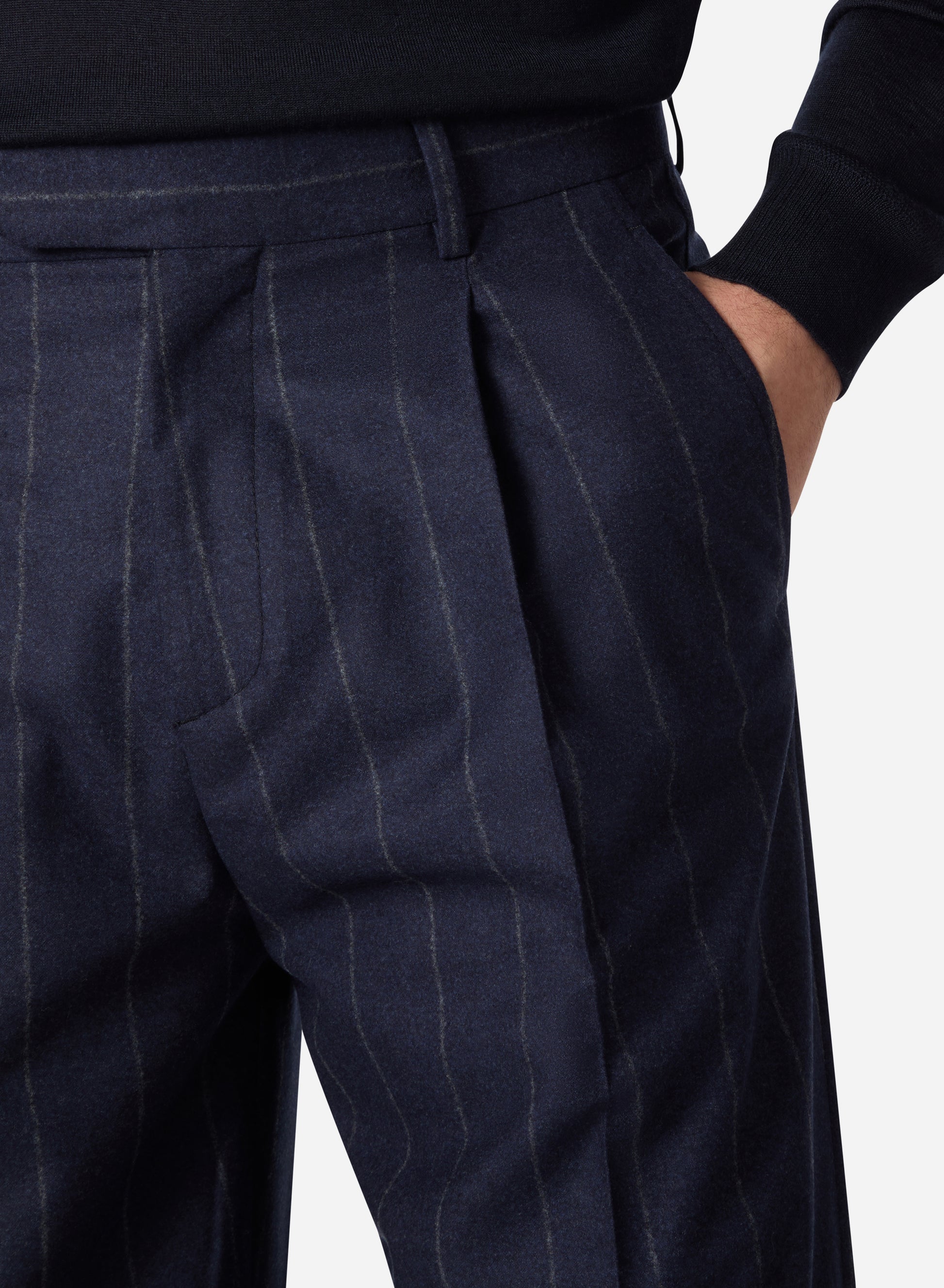 Cut from a refined blend of wool, silk, and cashmere, these single-pleat trousers offer soft structure, gentle drape, and a smooth hand feel. The navy pinstripe pattern adds depth and classic tailoring detail, creating a piece that transitions effortlessly from office to evening.