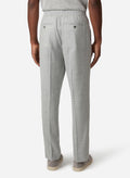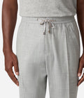 Cut from a refined blend that unites wool's structure, silk's fluid drape, and linen's natural breathability, these drawcord pants embody relaxed sophistication. The fabric offers movement with ease yet maintains impeccable lines. Light Gray captures the pale marble and ivory tones that define Greece's architectural heritage, immediately evoking joyous summer.