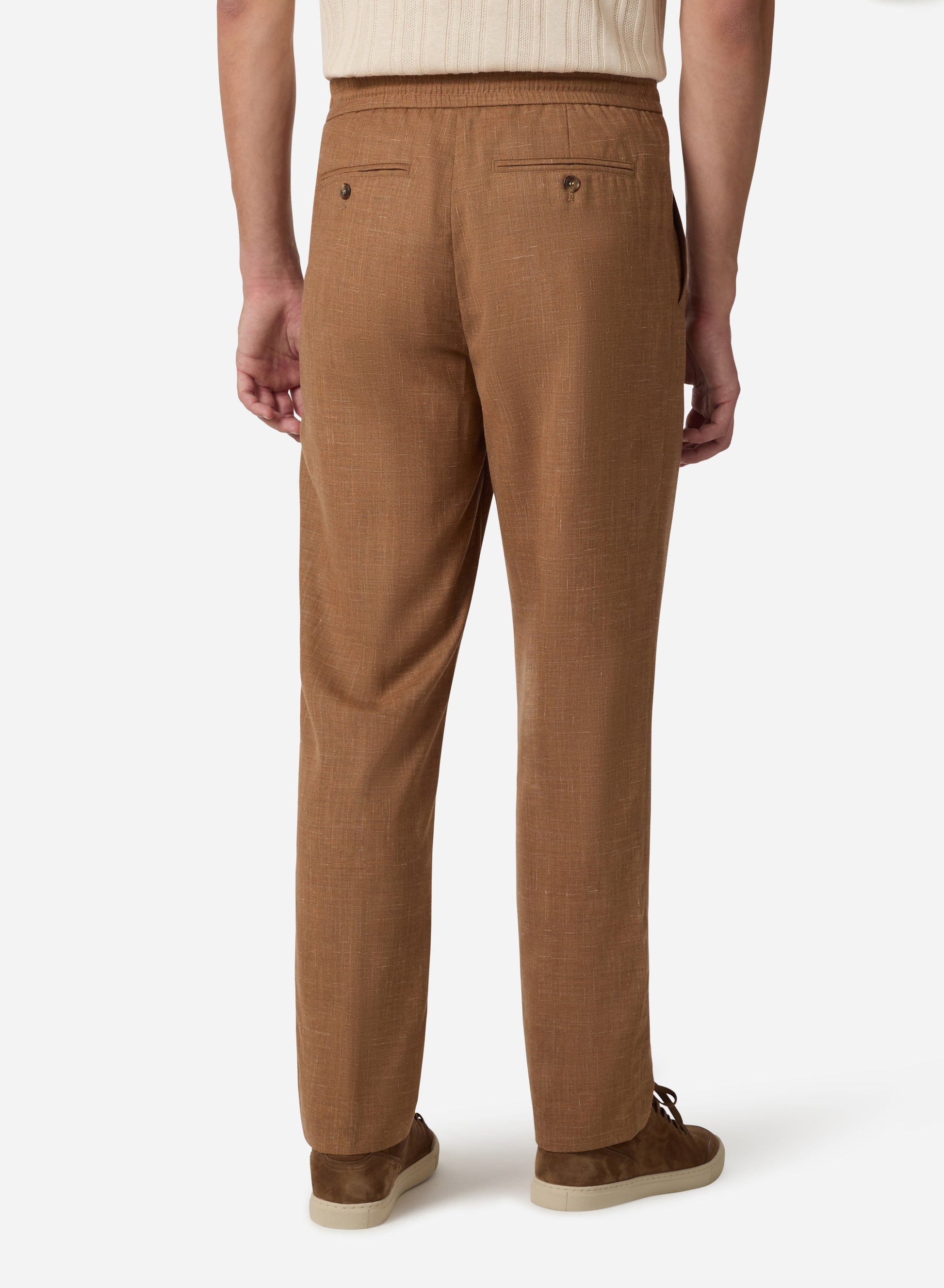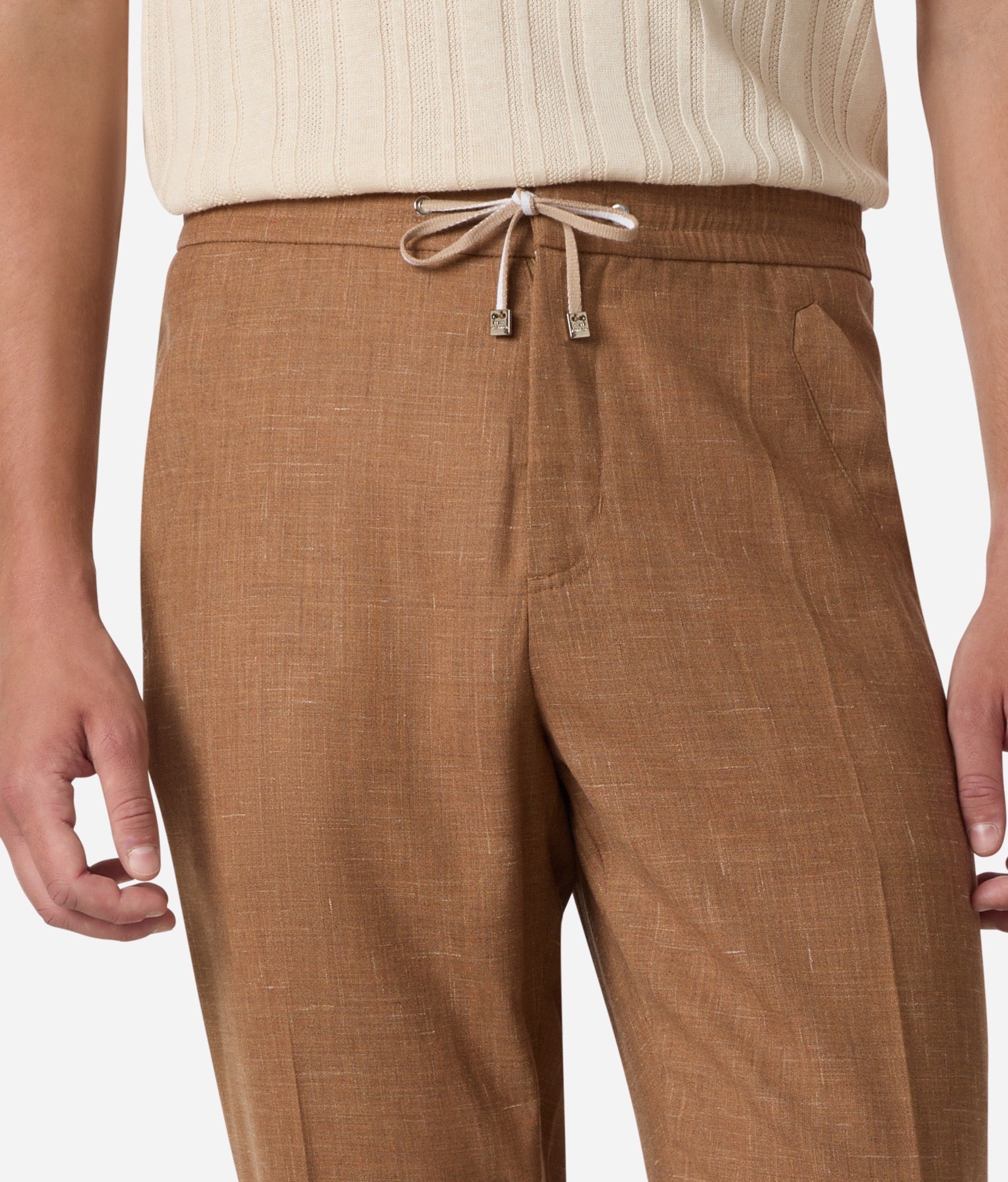 Drawcord pants that unite wool's structure, silk's fluid drape, and linen's natural breathability.